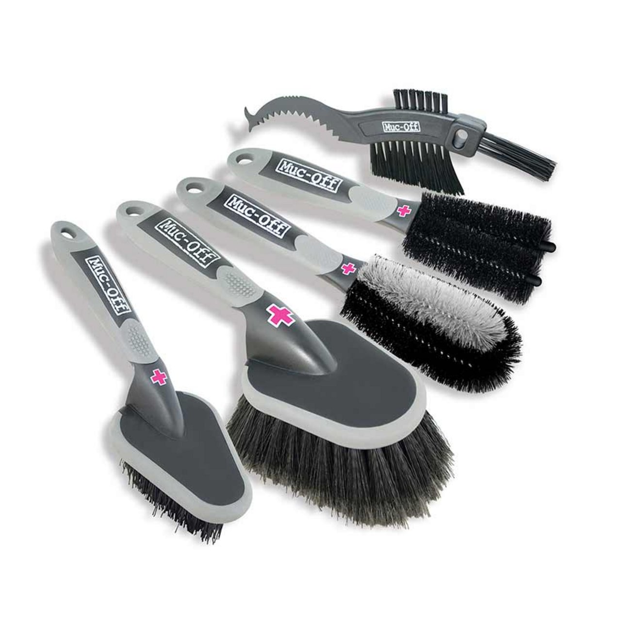 Product Info Featuring all five Muc-Off brushes in a handy storage bag Claw brush ideal for chain, cassette and sprocket Detailing brush ideal for tight areas such as suspension mounts or fork crowns Soft washing brush ideal for your bike frame and wheels Wheel and component brush ideal to clean rim and spokes with ease Two-prong brush ideal to reach hard-to-shift dirt on your components