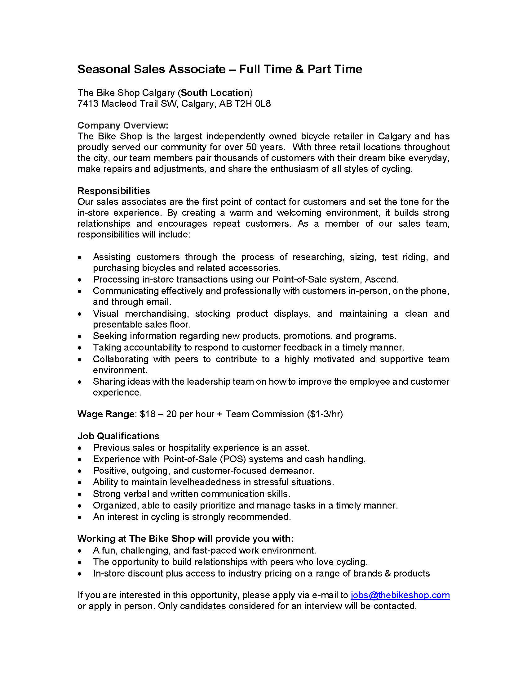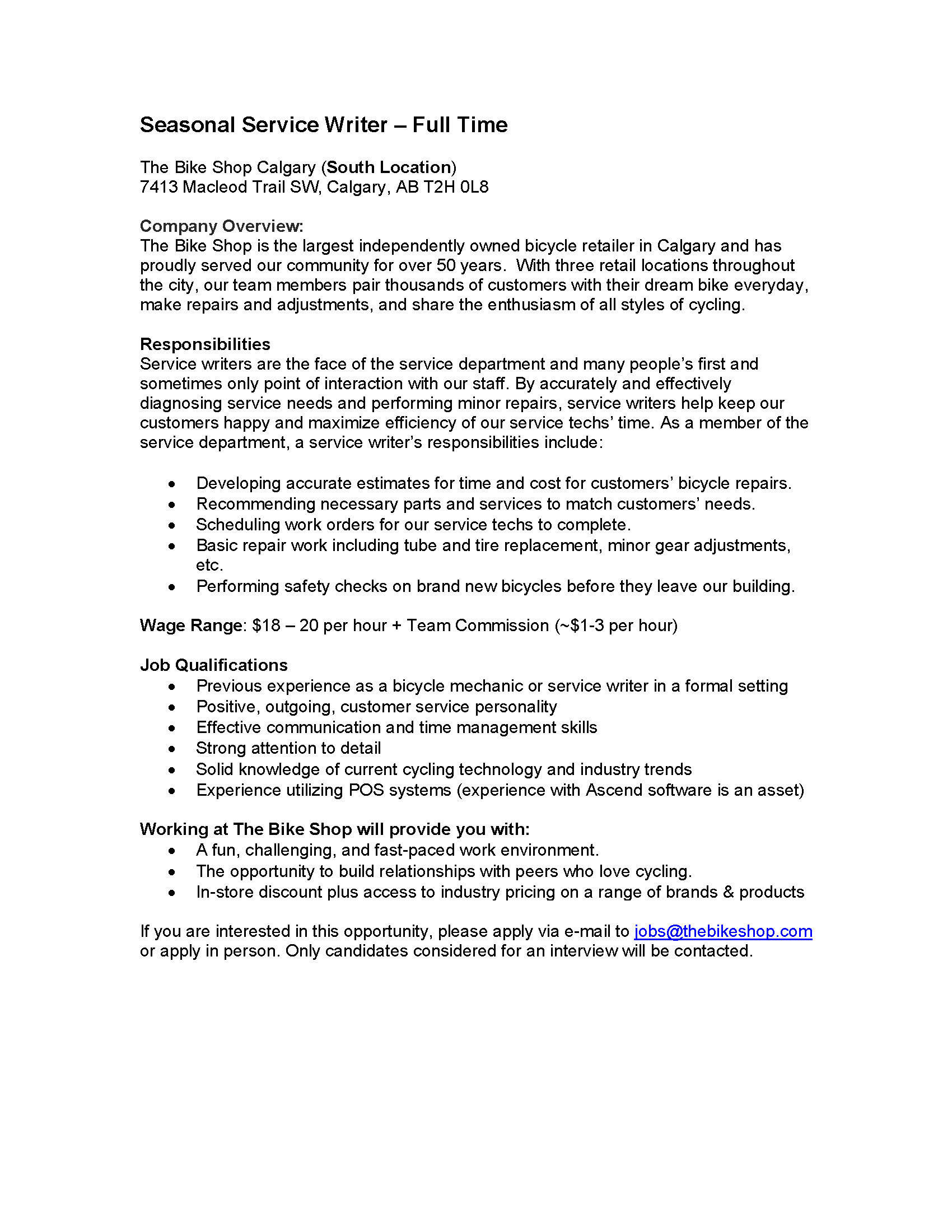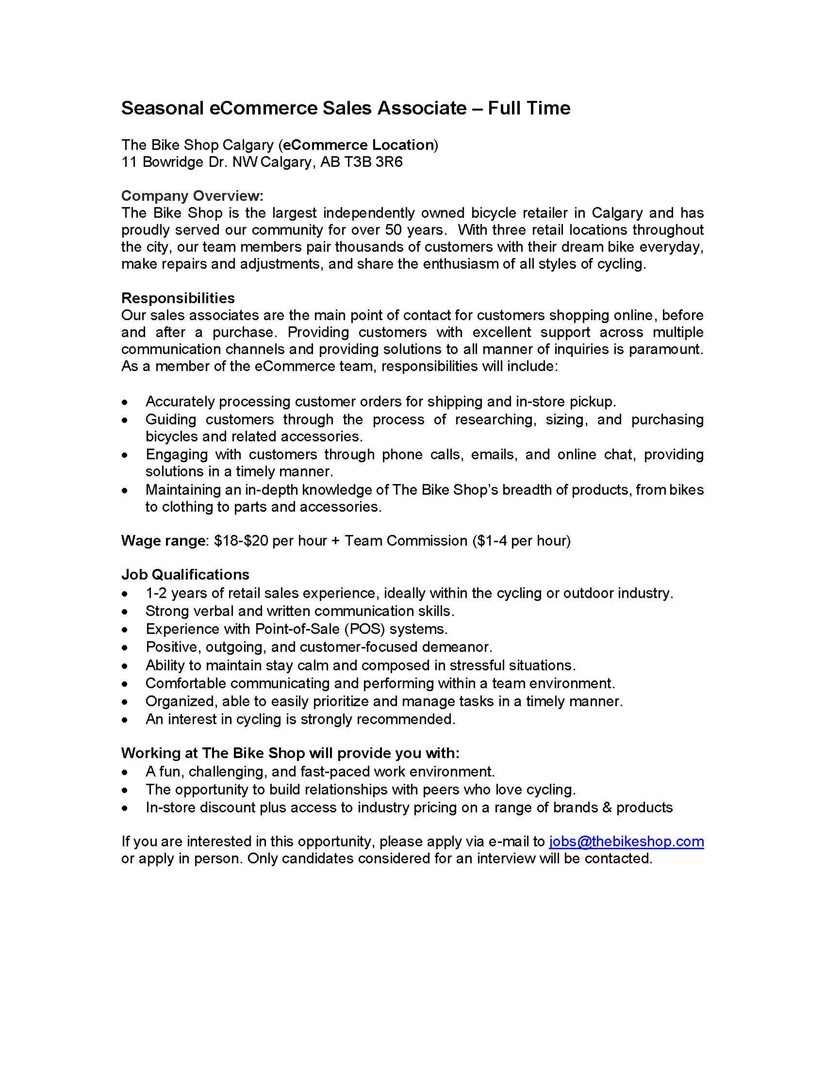 All positions are currently filled. For general career inquiries at The Bike Shop (any location) please email us at jobs@thebikeshop.com. Only candidates being considered for interviews will be contacted.