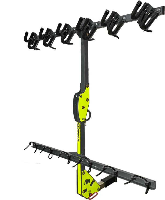The Mammoth Mounts 6-bike rack is as strong as a mammoth and is built to last. It handles everything from family camping trips to shuttling fire roads with ease. Fits all sizes of wheels, bike frames and even drop bar road bikes. Made in Canada with CNC laser cut steel. Galvanized and powder coated for extra corrosion resistance.